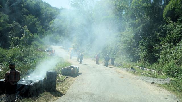 Die Straße wird dann und wann ausgebessert.