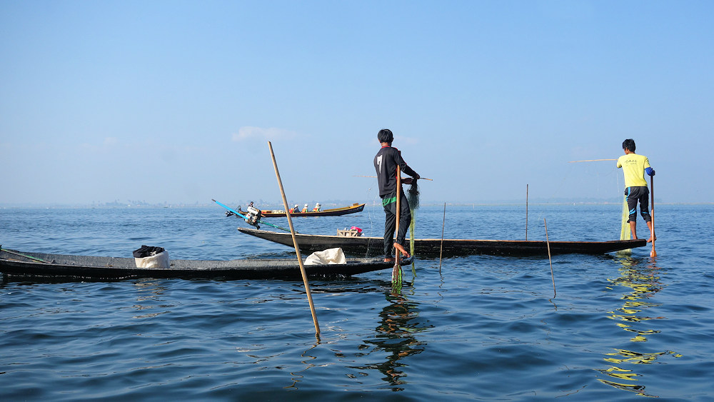 Und hier sieht man die welteinmaligen Einbeinruderer in Aktion. Rudern und beide Hände freihaben ist genial.