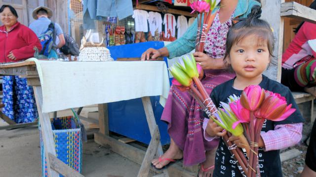 Junge Lotusblumen-Verkäuferin. Die Blumen sind als Opfer für den Tempel gedacht.