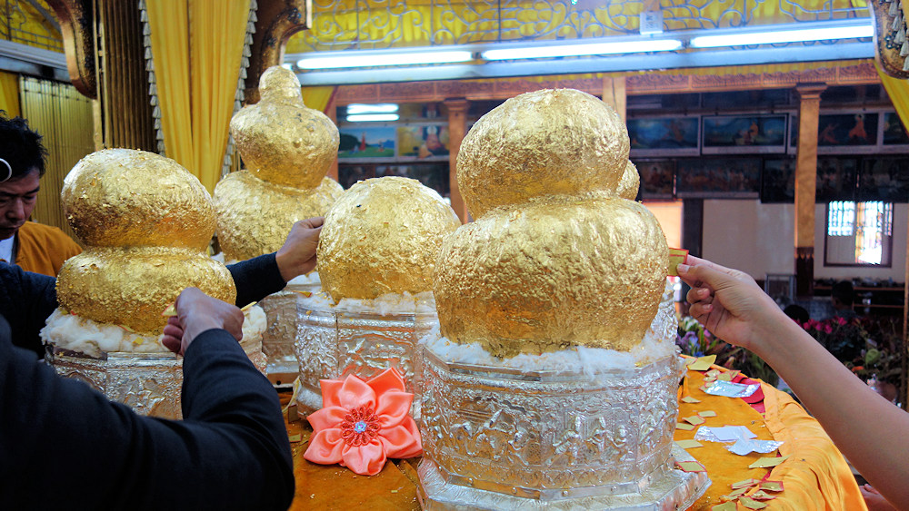 Männer kleben Blattgold auf Buddha-Figuren, die schon unkenntlich sind. Das Blattgold kann vor der Pagode erworben werden.