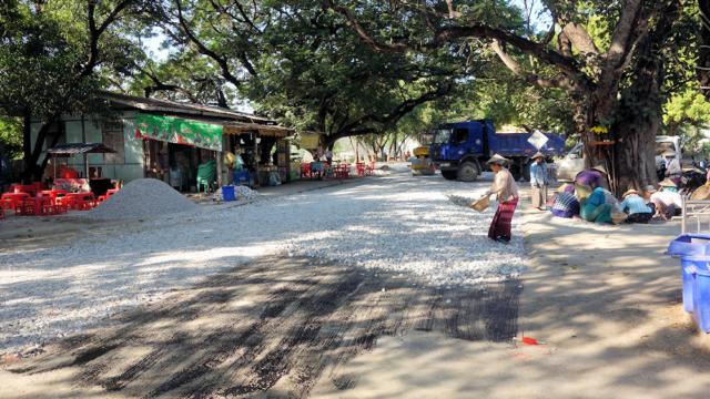 Immer wieder bewundern wir die Frauen, die Schwerstarbeit im Straßenbau leisten.