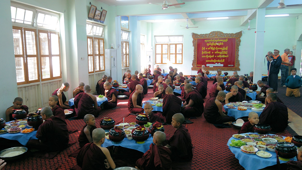 Drinnen warten volle Tische auf die Mönche. Es gibt nicht nur den Reis, den sie draußen empfangen haben....