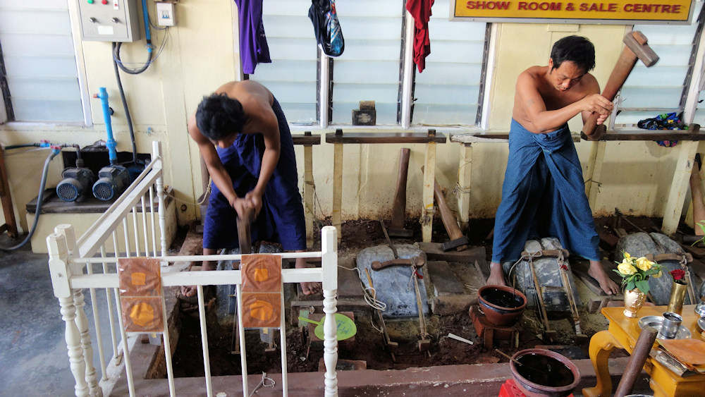 Viel Blattgold wird zum Verzieren der Pagoden gebraucht und auch die Gläubigen spenden Blattgold wie wir vorgestern am Inle-See gesehen haben. Hier wird es hergestellt bzw. geschlagen.