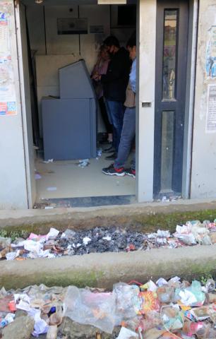 Das ist ein Geldautomat. Der Geldautomat war in genauso schlimmen Zustand wie sein Umfeld. Aber er spuckte sogar Rupien aus.