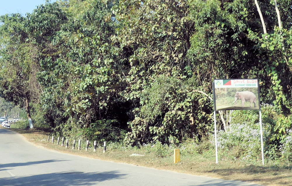Auf dem Schild steht: Langsam fahren, Elefanten-Wildwechsel