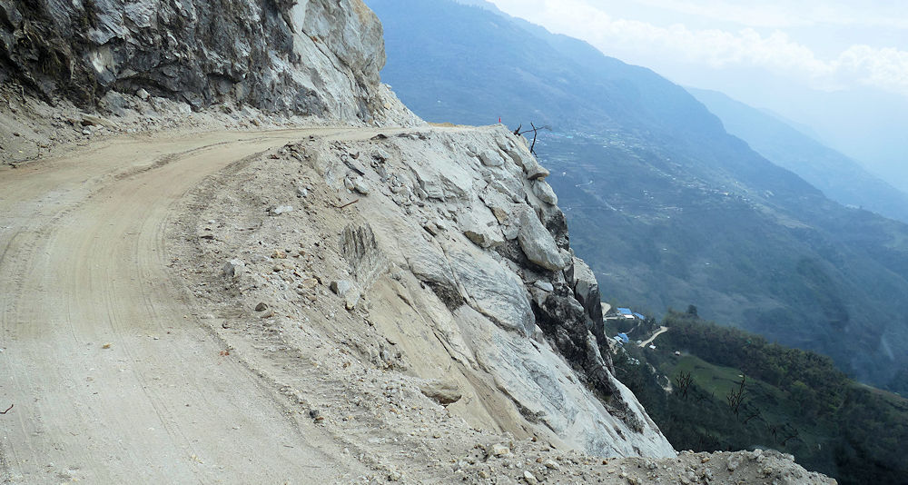 03.04.2018, Gangteng, BhutanEtwas weg von der Hauptstadt wurden die Straßen nun schlechter. Es wird aber heftig gebaut durch indische Arbeiter. Wegen der schwierigen topographischen Verhältnisse sind auch auf fertiggestellten Abschnitten immer wieder Erdrutsche.