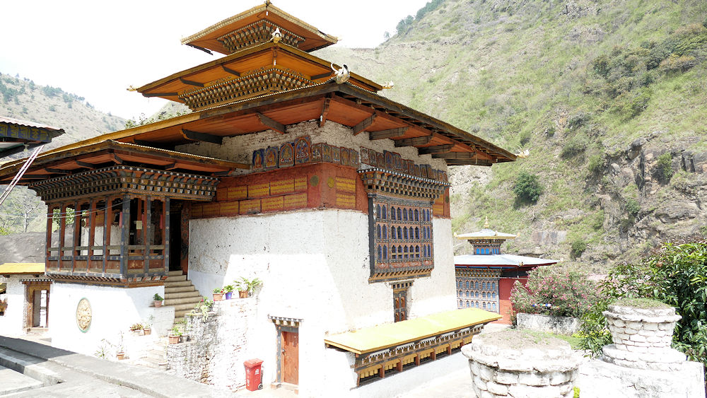Das Kloster Gom Kora ist die bedeutenste sakrale Stätte Ostbhutans. Das Kloster wurde an einem Ort errichtet, an dem Guru Rinpoche höchstpersönlich (Wikipedia Guru Rinpoche) meditiert hat. Der Felsblock neben dem Klosterbau war seine Zuflucht. Schön liegt das Kloster im Tal und ist eine Oase der Ruhe. Wir durften im Klosterbereich parken.
