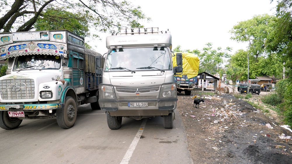 Dem wollten wir kurz vor Imphal, es waren keine Schlammabschnitte mehr zu erwarten, abhelfen. Beim nächsten Car Wash fragten wir, die Herren lagen auf der Schlafmatte in der Hütte, nach, und bekamen positiven Bescheid. Allein die Technik (die Förderpumpe) versagte nach 10 Minuten und nach angemessener Wartezeit ohne erkennbare Aktivität fuhren wir einfach weiter. Zur Ehrenrettung muss gesagt werden, dass sich am nächsten Car Wash zwei Hochdruckspritzen und drei Männer um die Sauberkeit unseres LKWle kümmerten. Und sie machten es gründlich.