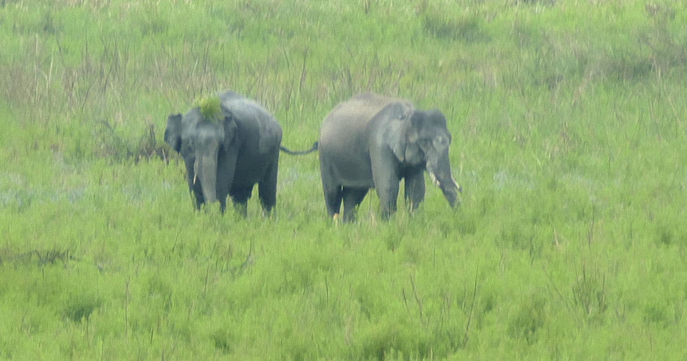 10.04.2018, Kaziranga, Assam, IndienDie Strecke nach Kaziranga führt ja die letzten 40 km entlang des Kaziranga Nationalparks. Hatten wir an der Herreise, wir machten ja damals eine Safari in den Park, Nashörner nur in der Ferne ausgemacht, so sahen wir heute, unweit der Straße, wilde Elefanten und Nashörner. Jetzt ist ja auch Frühjahr und frisches Grün überall.