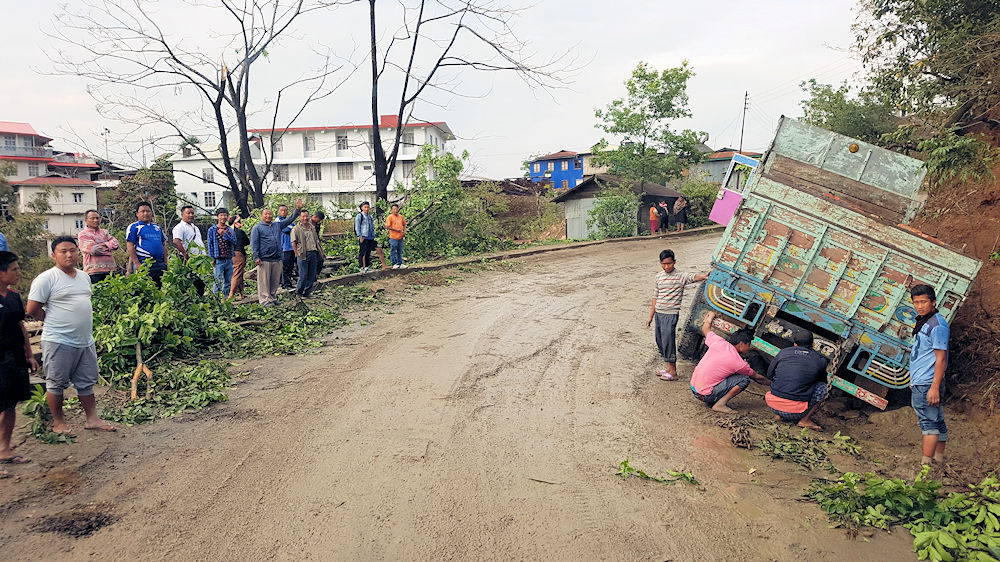 12.04.2018, Kohima, Nagaland, IndienDie Straße war noch schlechter als wir es in Erinnerung hatten. Dreieinhalb Monate heftiger LKW- und Baustellenverkehr hatten sie nicht besser gemacht. Dazu kam noch, dass wegen Gewittern mit heftigem Regen die Fahrt zu einer Schlammschlacht wurde. Für die 213 km nach Kohima waren mal wieder 10 Stunden Fahrzeit erforderlich. Unser Fahrzeug ist voller Schlamm und wir waren richtig geschafft.