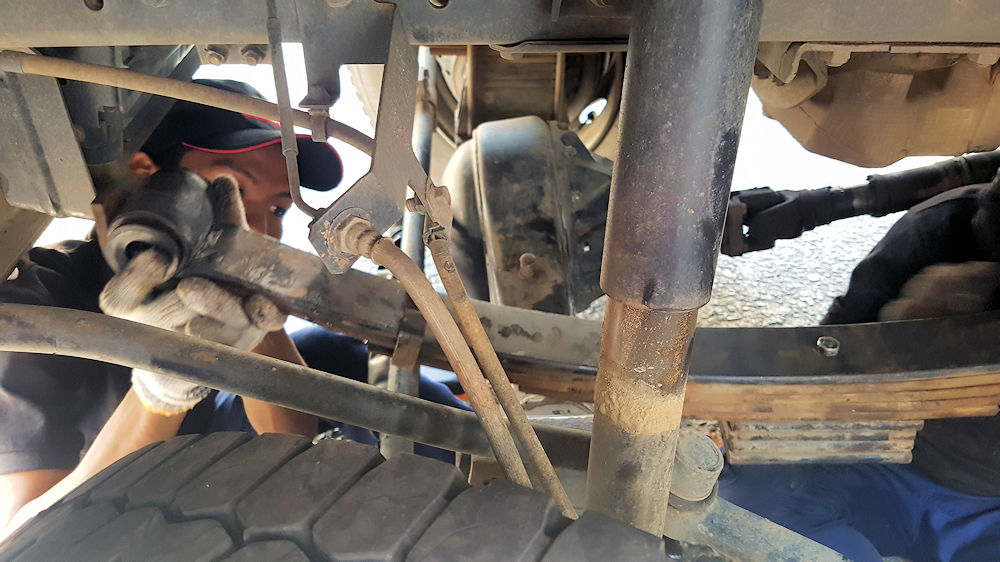 20.04.2018, Yangon, BirmaPünktlich auf die Minute kamen die Serviceleute von FUSO. Sie hatten einen nigelnagelneuen Servicetruck mit allen Schikanen, aber beim Ausbauen des kaputten Federpäckchens taten sie sich schwer. Nach Ausbau fuhren sie gleich los um eine passende Feder zu finden. Es waren lange vier Stunden bis sie wieder zurückkamen.
