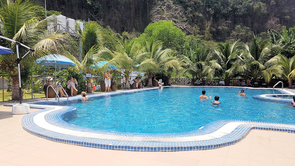 Heute Nachmittag haben wir eine Exkursion in eine Tropfsteinhöhle zugunsten des wirklich schönen Pools (man hat nicht immer ein solch sauberes Wasser) geschwänzt und die Sonne verschwand auch gottseidank bald hinter den Karstfelsen am Resort.