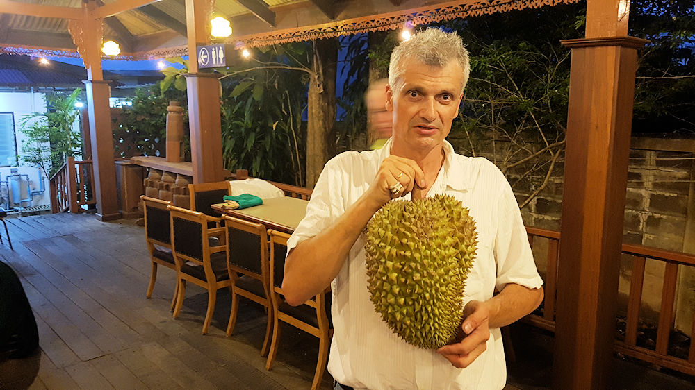 Kostya hatte unterwegs noch eine Durian-Frucht gekauft. Gehört hatten wir ja schon viel, aber verkostet noch nicht. So eine Durian-Frucht, in der Größe wie auf dem Foto, kostet so 17 Euro. Nun wird ja viel erzählt über die Durian: "Königin der Früchte" oder "Stinkefrucht". Aus meiner, gerade erworbenen Erfahrung, stimmt beides nicht.