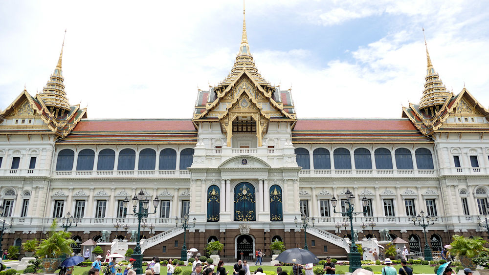 Nächste Station war der Grand Palace und der Tempelbezirk innerhalb der Palastmauern. Wir waren schon mal vor 20 Jahren in Bangkok, aber solche Menschenmassen an Besuchern gab es damals nicht. Die Vielzahl waren Chinesen und die durften vor 20 Jahren noch nicht in Massen auf Urlaubsreise gehen. Bangkok hatte damals vielleicht 50 Wolkenkratzer. Heute sind es 1.000. Unter allen Städten der Welt zieht Bangkok die meisten Besucher an: Über 20 Mio. Touristen besuchen es jedes Jahr. Bangkok selbst hat 12 Mio. Einwohner.