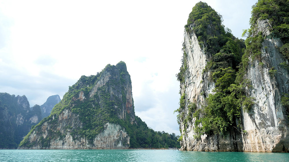 Wir aber bestiegen ein Langboot und fuhren fast eine Stunde zu diesem Resort auf dem See. Der See liegt, umsäumt von schroffen Karstfelsen, in einer herrlichen Dschungellandschaft. Die ganze Landschaft ähnelt der Halong-Bucht in Vietnam (vgl. 04.12.2017). Unser Ankunft im Resort wurde von einem stattlichen Tropenschauer begleitet, der uns ziemlich nass machte. Aber kein Problem bei über 30 Grad.
