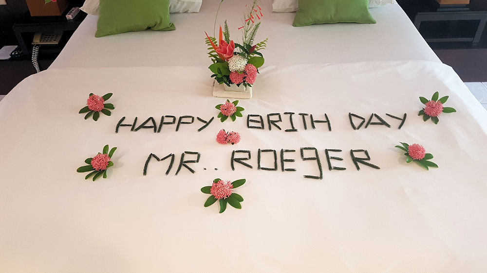 09.05.2018, Khao Lak, ThailandUnd täglich grüßt das Murmeltier... Könnte man fast sagen, weil das Hotel auch für meinen Geburtstag heute wieder mit einer Geburtstagstorte und dem schönen Zimmerschmuck glänzte.