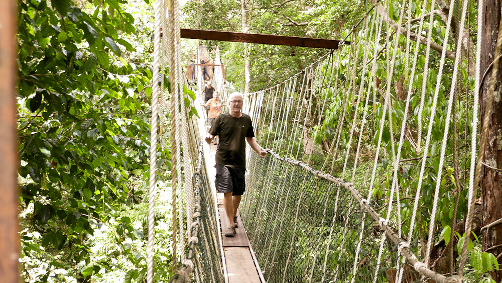 Vormittags machten wir einen Dschungel-Spaziergang. Mit einer kleinen Fähre sind wir über den Sungai Tembeling Fluss gefahren, auf dessen anderer Seite der Nationalpark ist. Da es in der Nacht geregnet hatte, war alles sehr feucht und auch wir waren bald schweissnass. Es war auch relativ anspruchsvoll, wie der Weg steil nach oben ging. Zwar war alles Holzbohlen- Weg bzw. Treppe, aber bei der Hitze und Luftfeuchtigkeit schwitzte man schon ohne Bewegung. Höhepunkt waren die Hängebrücken durch die Baumwipfel, die ganz andere Perspektiven auf den Dschungel boten. Teilweise führten die Hängebrücken in 45 m Höhe durch den Urwald. Aber selbst dort ragten die Urwaldriesen, an denen die ganze Konstruktion hing, dann noch 20 m weiter hoch. Ausser Kleintieren, Blutegel, die uns anfielen, Zikaden und eine Tarantel, haben wir nichts gesehen.