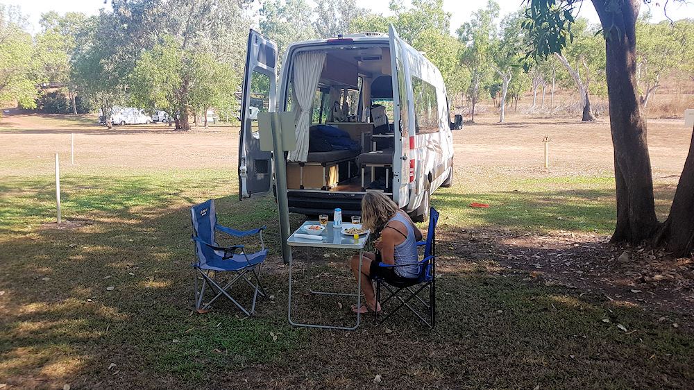 Wir sind wieder aus dem Kakadu National Park herausgefahren. Kurz nach Parkende auf einen schönen Platz zum halbem Preis wie im National Park.