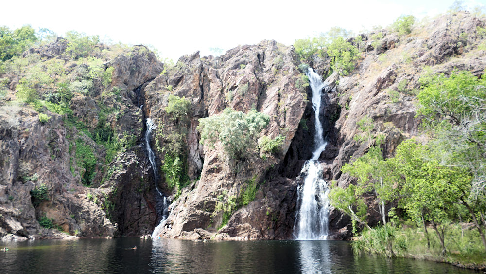 Für das alles entschädigt aber die Natur. Kaum zu glauben, dass hier im trockenen Outback plötzlich ein Wasserfall nebst riesigem Pool zu finden sind: Die Wangi Falls. Aber auch schon auf der Hinfahrt sind die gewaltigen Termitenbauten der Kompasstermiten zu sehen. Sie richten ihre Hügel exakt nach den Himmelsrichtungen aus, um optimale Beschattung zu haben. Die Wangi Falls haben auch, vor allem heute am Sonntag, viele Tagesausflügler, die zum Baden hierherkommen. Ranger garantieren für krokodilfreie Badefreuden.