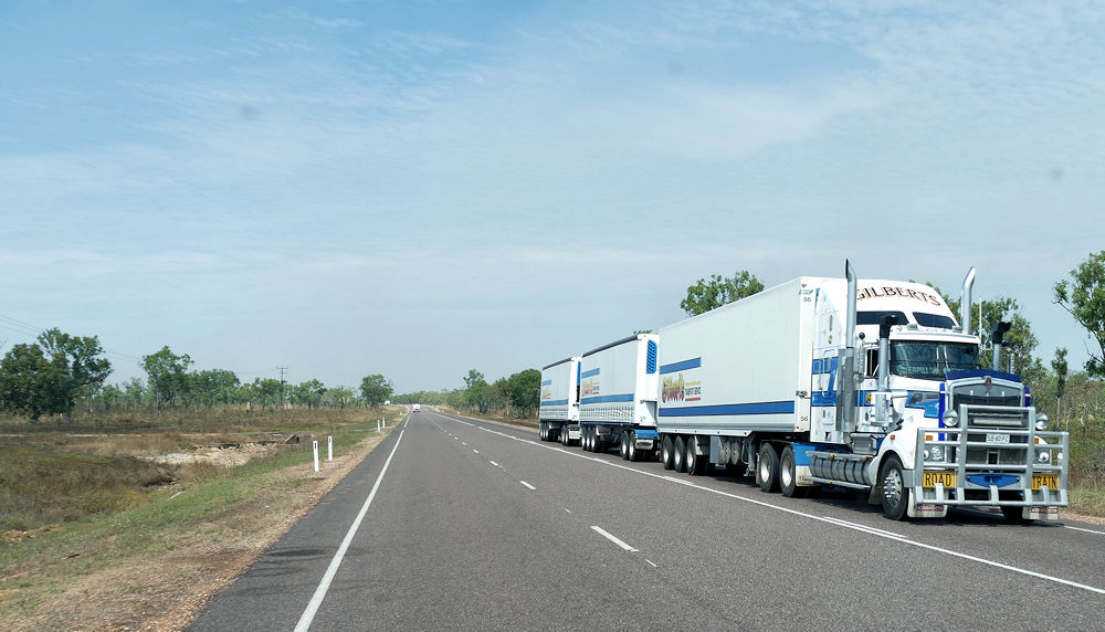 Wir sind ja ein Stück des Stuart Highways gefahren, der Nord- und Südaustralien durch die Mitte von Australien, das rote Herz, verbindet. 2.700 lange Kilometer. Hier fahren die Roadtrains, die Lastwagen mit den zwei Anhängern.