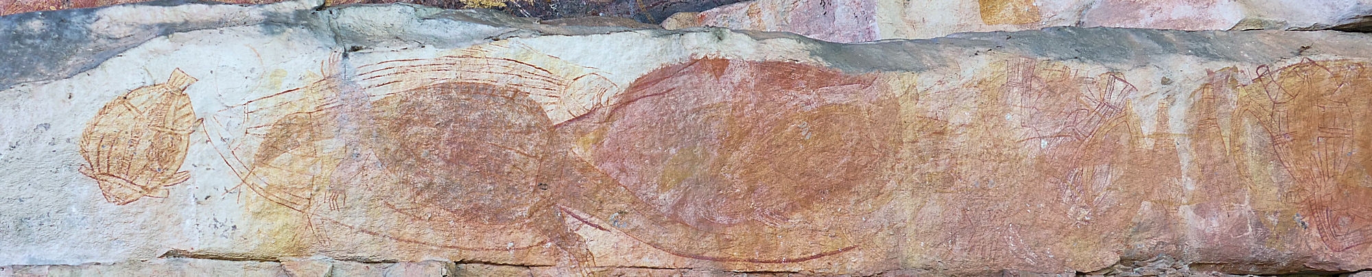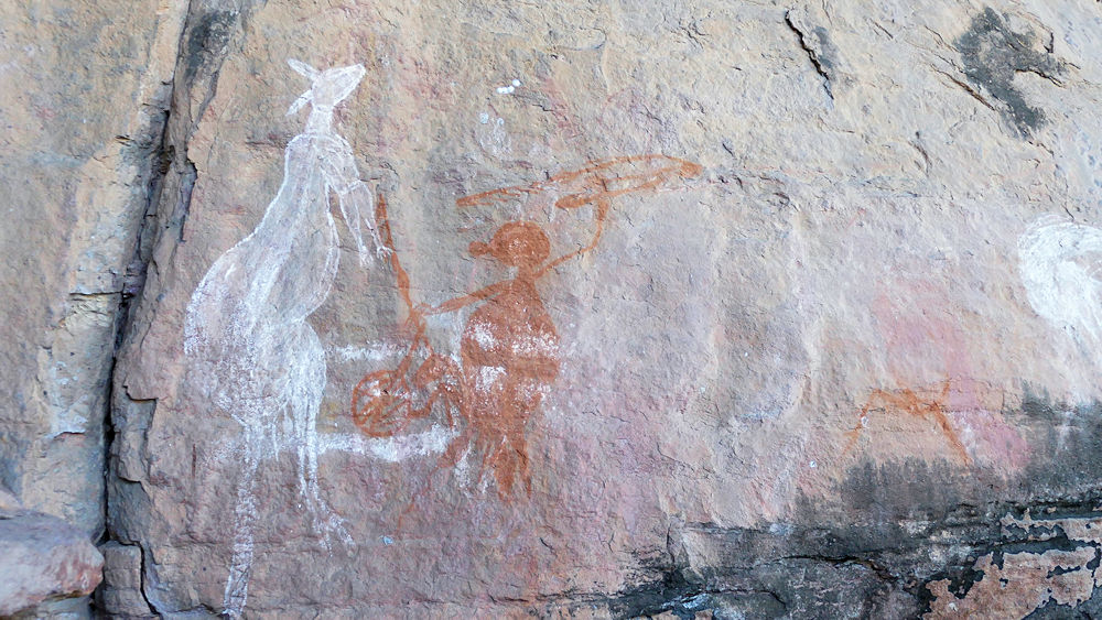 Der Kakadu Nationalpark ist ja nicht nur ein Naturdenkmal, sondern das Land gehört den Aborigines und wird seit tausenden Jahren von ihnen bewohnt. Heute haben wir uns deren Kultur ein wenig genähert. Trotz der gerade herrschenden Trockenheit: es gibt genug Wasser und im November beginnt die Regenzeit. Die Aborigines hier waren in der Trockenzeit in den tieferen Gebieten bei der Jagd, in der Regenzeit in den höhergelegenen Gebieten. Felsüberhänge und Höhlen waren ihre "Häuser" und an den Felsen hinterließen sie ihre Geschichte als Felszeichnungen. Die Felszeichnungen des Nourlangie Rocks zählen zu den schönsten im Kakadu Nationalpark.