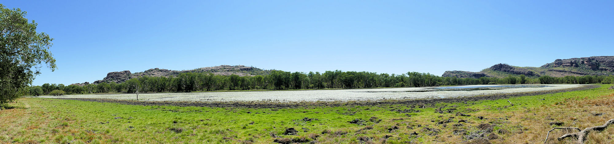 Als wir eintrafen, floß der East Alligator River südlich in Richtung Meer, wie es sich gehört. So eine Viertelstunde später floß gar nichts mehr und ein paar Minuten später floß der Fluss "bergauf". Das hat mit der Flut zu tun, die 95 km weiter südlich, an der Mündung, den Fluss rückstaute und dessen Fließrichtung umkehrte.