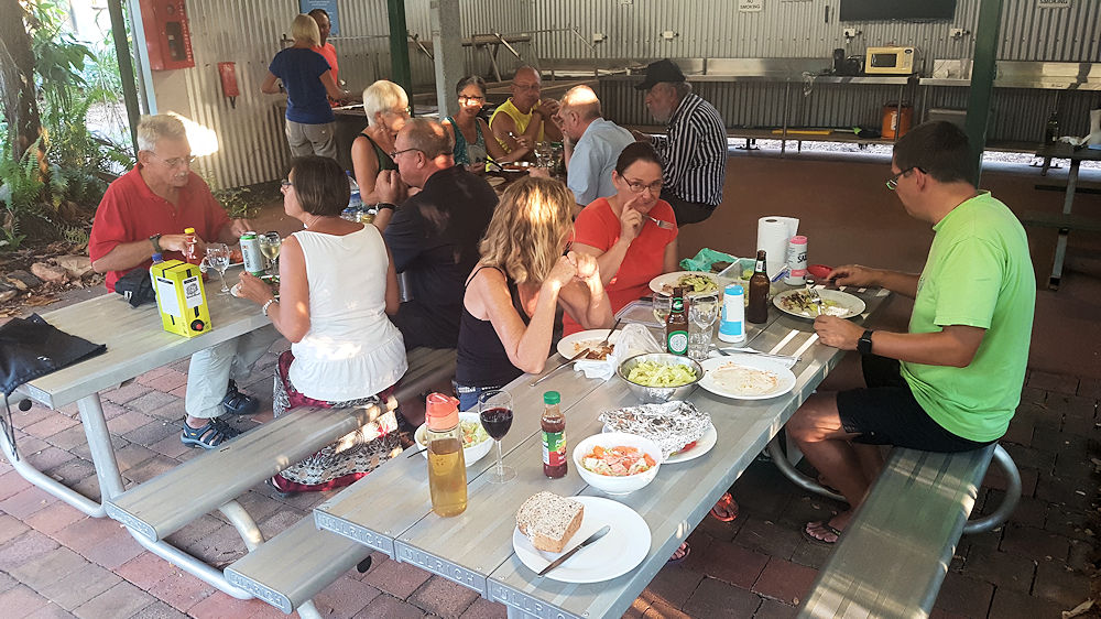 19.08.2018, Discovery Park, Darwin, Northern Territory, AustralienIn jedem australischen Campground befindet sich eine oder mehrere BBQ (Barbecue) Einrichtungen mit einer Stahlplatte, die mit Gas erhitzt wird. Kühlschrank, Tische, Bänke und Spüle stehen auch zur Verfügung. Und so haben wir (die meisten der in Darwin Gestrandeten aus unserer Gruppe) heute ein echt australisches BBQ veranstaltet. Im Sinne, dass die Fahrzeuge diese Woche aus der AQIS kommen, hoffentlich das letzte Mal.