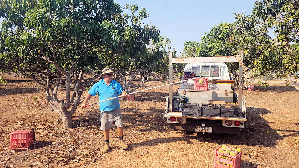 Zur Zeit ist ja Mangoernte und Charlie, unser Gastgeber, erklärte uns die Ernte. Wegen der Vögel, hunderte von Kakadus sind allgegenwärtig, werden die Früchte schon 7 Tage vor der Reife geerntet und sie reifen dann in einem geschützten Bereich nach.