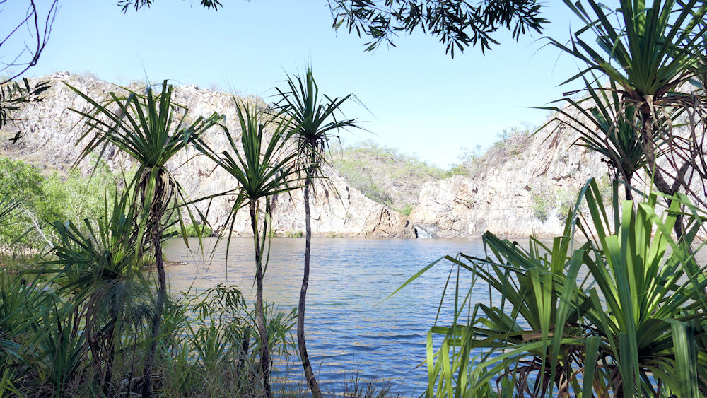 01.10.2018, Edith Falls, Northern Territory, AustralienHeute gings nun endlich richtig los in Australien. Unser erstes Ziel war ein Teil des Nitmiluk Nationalparks, die Edith Falls. Es ist einfach erstaunlich, dass mitten im trockenen Outback plötzlich ein Fluss mit Wasserfällen und kleinen Seen (Pools) vorhanden ist. Dazu muss man aber den Stuart Highway, der 2.700 km von Darwin nach Südaustralien führt, verlassen, und 20 km in den Nitmiluk NP fahren.