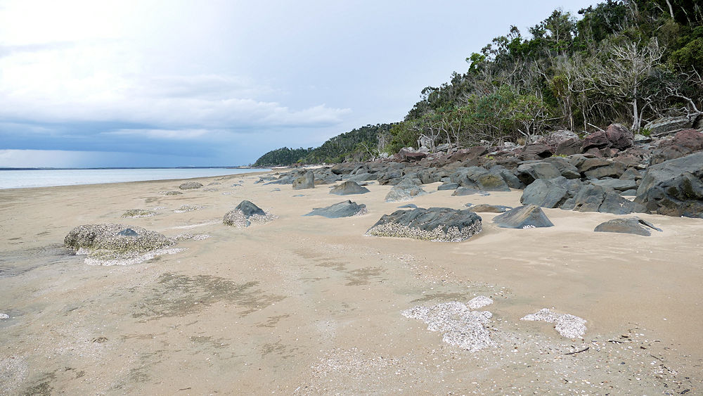 Wirklich schön und jetzt in der Nachsaison in Queensland so gut wie nichts los. Auch das bedeckte Wetter mit angenehmen 25 Grad trug vielleicht dazu bei, dass keine Badegäste waren. Oder die Quallen: einige Schilder besagen ab Oktober seien sie da, einige Schilder behaupten ab November. Wir wollten das nicht testen.