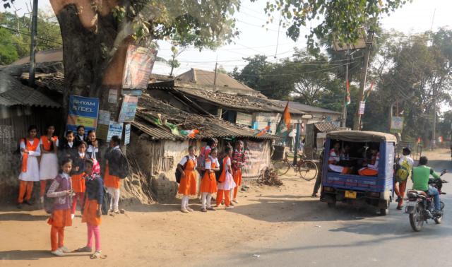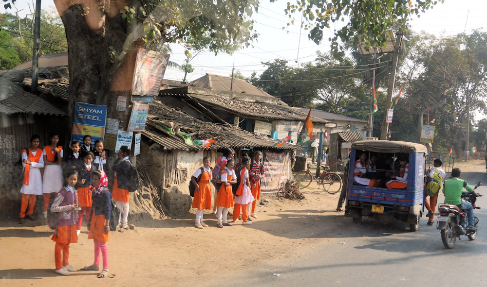 Schulmädchen an der Bushaltestelle. Die befindet sich dort, wo man die Hand hebt.
