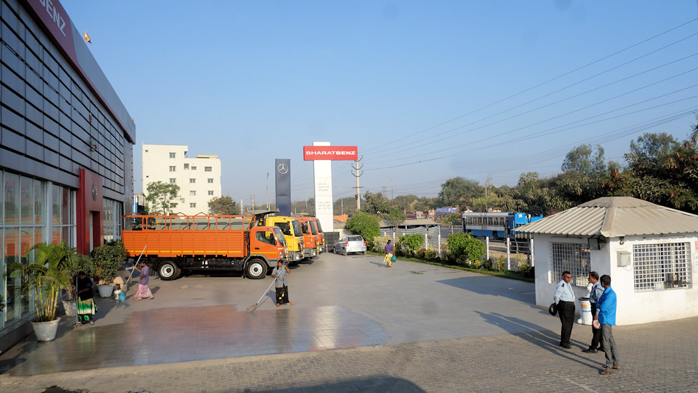 Die Servicezeiten bei Bharatbenz sind für uns ungewöhnlich: 09:30 bis 22:00 Uhr. Aber zuerst muss auch mal der Hof feucht aufgewischt werden.