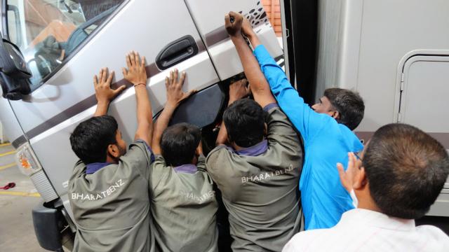 Mit so vielen Händen ist die Kabine leicht zurückgekippt.