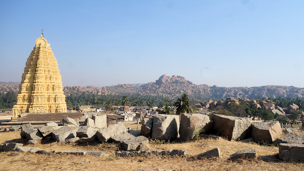 Der Gopuram des Virupaksha Tempels, um 1440 erbaut, ist nunmehr gelblich angemalt. Mit Weltkulturerbe hat das unserer Aufassung nichts zu tun. Der Tempel ist auch noch aktiv in Betrieb.