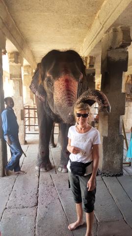Der Elefant nimmt mit dem Rüssel einen Geldschein, gibt im seinem Mahut und streichelt dann mit seinem Rüssel übers Haupt.