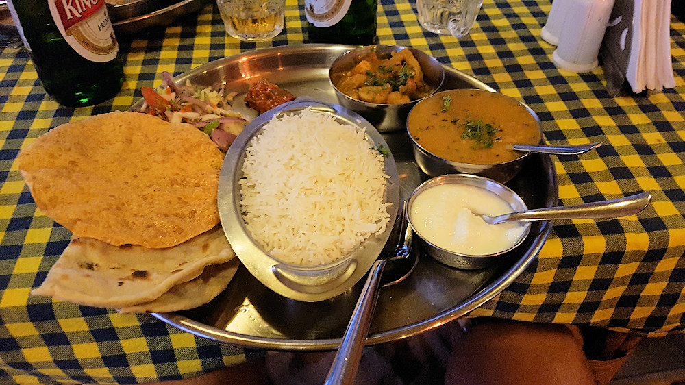 Die Platte mit verschiedenen Curries und Dals nennt sich Thali. Hier die vegetarische Variante. Es gibt sie auch mit Fisch oder Huhn.