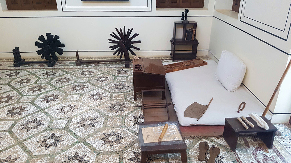 Gandhis Arbeitszimmer.Das Spinnrad symbolisiert den Widerstand gegen die Briten. Jeder Inder sollte selber sein Garn herstellen und importierte englische Stoffe boykottieren.