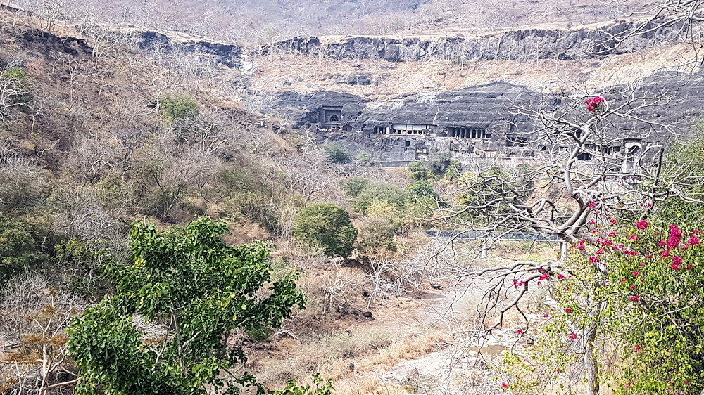 Die Ajanta-Höhlen liegen in einer Flussbiegung des Waghora-Flusses, der nur im Monsun Wasser führt.