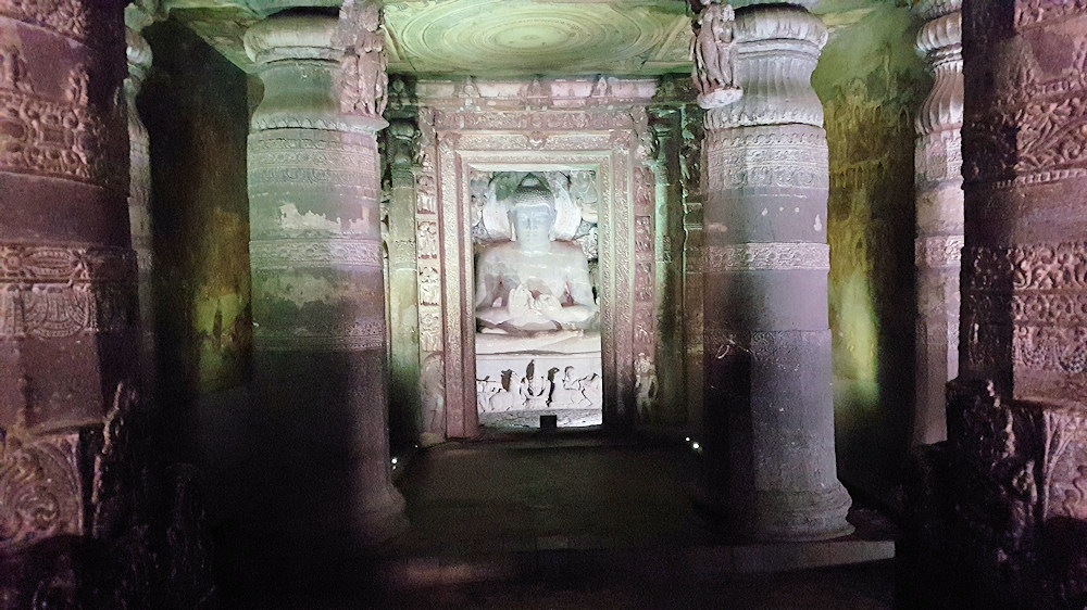 Im Gegensatz zu Ellora sind die Höhlentempel bemalt und die Säulen feiner herausgearbeitet.