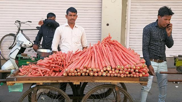 Straßenmarkt in Udaipur. Die Karotten sind etwas länger als bei uns, und röter.