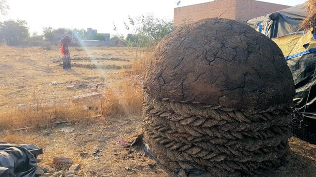 der in Stapeln bevorratet wird. Hinten trocknet die Frau Dungfladen.