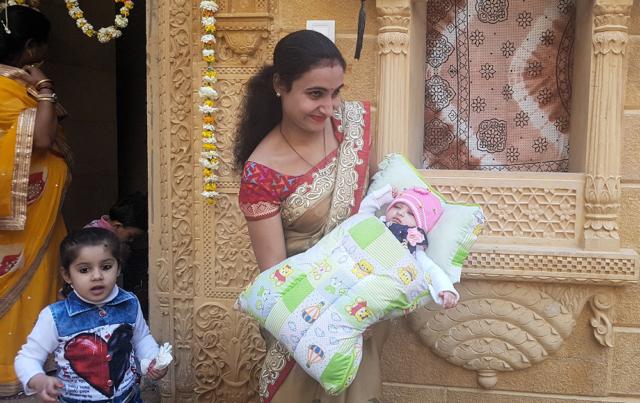 Stolz wird das 5 Monate alte Baby gezeigt. Mutter und Kind sind zur Hauseinweihung gekommen.