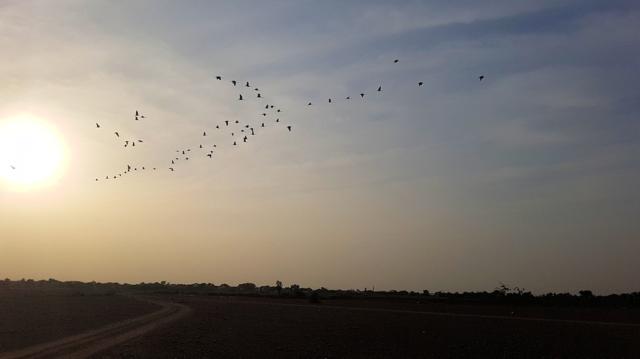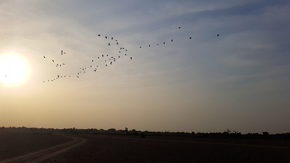 Am Abend fliegen die Kraniche zu (sicheren?) Schlafplätzen in die Wüste hinaus.
