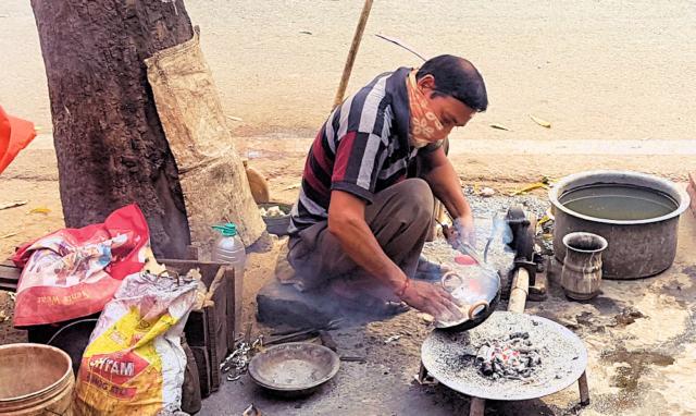 vorbei an diesem Meister, der Töpfe innen verzinnt....