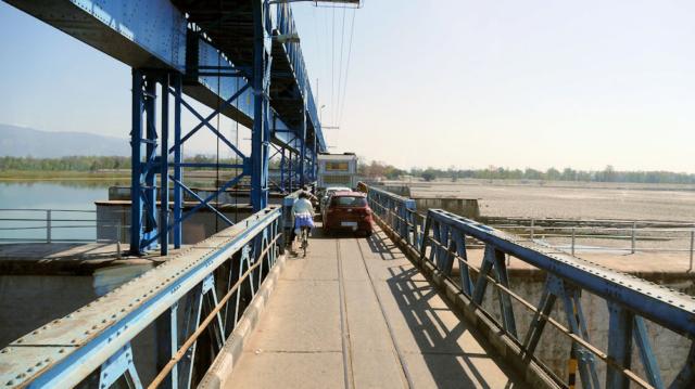 Schmale Straße über das Stauwerk am Mahakali Nadi Fluss.