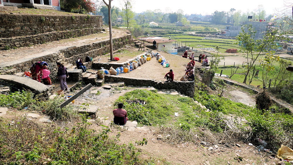 Trotz Himalya. Wasser ist auch in Nepal knapp und diese Frauer warten stundenlang an der Wasserstelle, es kommt nur ein dünnes Rinnsal heraus, bis sie ihre Gefäße füllen können.