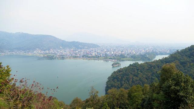 Blick von der Stupa (anderer Name für die Pagode) auf Pokhara und den See.