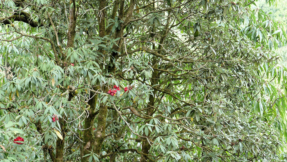 Es gibt hunderte Arten von Rhododendron im Himalaya, nur wenige blühen jetzt. Die meisten blühen im mai und dann soll Nepal "rot" sein.