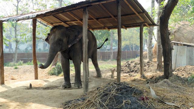 Wenn die Elefanten nicht auf Arbeit sind, werden sie so gehalten.