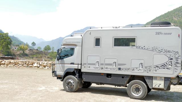 Unweit des Dzong stehen wir am Fluss mit Blick auf die Schneeberge.